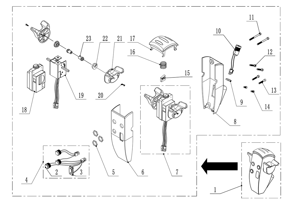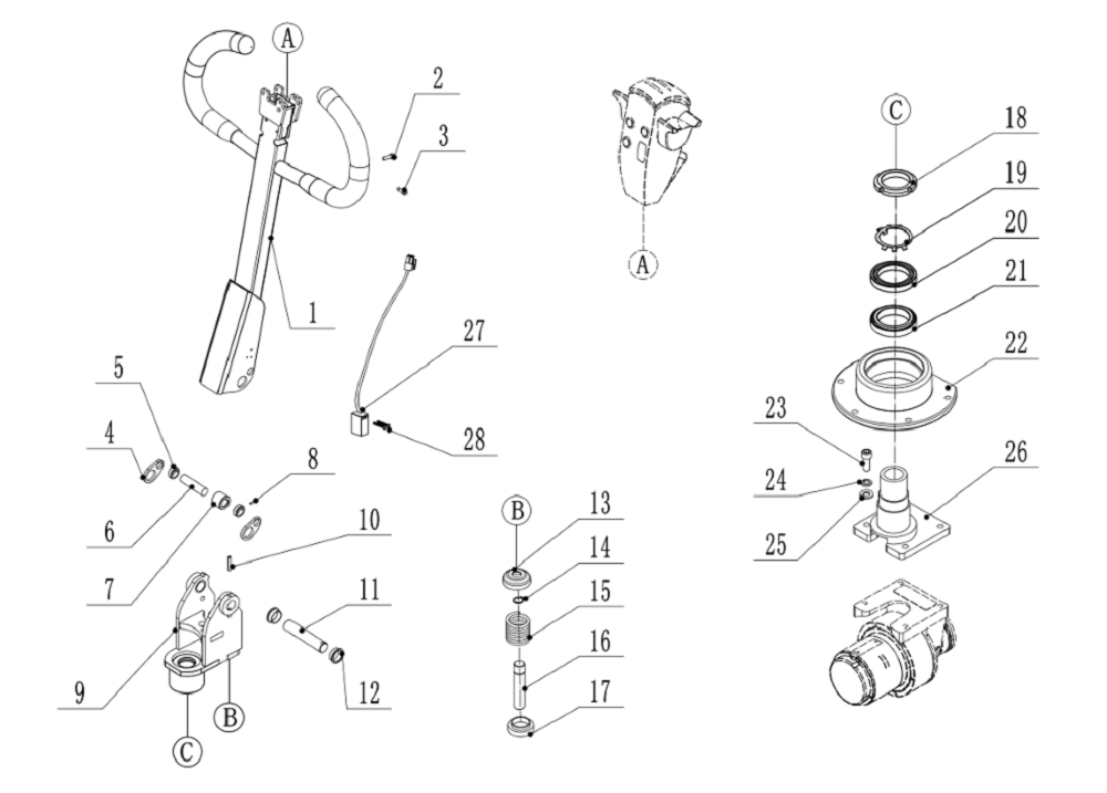 Die auf der Deichsel montierte Steuereinheit ist ein wirklich universelles und handliches Bedienfeld. Der Bediener findet Vorwärts-/Rückwärtsfahrmanipulatoren, Hebetasten, eine Hupe und einen Sicherheitsknopf zum Schutz vor Quetschungen. Die Deichsel selbst befindet sich auf der linken Seite des Stapleraufbaus, was die Sicht und Wendemanöver erheblich erleichtert.