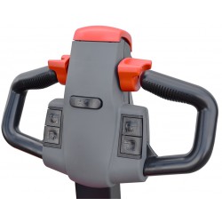 Ein Notfallknopf an der Oberseite der Deichsel schützt den Bediener vor Quetschungen. Das Antriebssystem ist mit einer modernen Bremse ausgestattet, die ein Wegrollen des Staplers beim Arbeiten an der Rampe verhindert. Durch seine kompakte Größe ist er sehr wendig und hat einen kleinen Wenderadius.